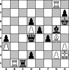 game notation in PGN-format [Event "Wann wird es Sommer?"] [Site "www.myChess.de"] [Date "2009.07.20"] [Round "1"] [White "sel"] [Black "BobbyF4"] [ECO "A00"] [WhitemyELO "1408"] [BlackmyELO "1562"] [Result "0-1"] [TimeControl "10/2592000"] [WhiteDays "30"] [BlackDays "29"] [MyChessNo "57682"] 1. b4 e5 2. e4 Bxb4 3. Ba3 a5 4. c3 Be7 5. Nf3 d6 6. h3 Nf6 7. d3 O-O 8. Be2 c5 9. c4 Nc6 10. Nc3 Nb4 11. Bc1 Bd7 12. a3 Nc6 13. Bb2 Nd4 14. Bc1 a4 15. Nxd4 cxd4 16. Nd5 Nxd5 17. exd5 f5 18. Rb1 b6 19. O-O Rb8 20. Bd2 g5 21. f3 f4 22. Kf2 g4 23. fxg4 Bh4+ 24. Kg1 b5 25. Bf3 bxc4 26. dxc4 Qc7 27. Qc2 Qc5 28. Bb4 Qa7 29. Kh1 Rxb4 30. Rxb4 Rc8 31. Be4 Be8 32. Bf5 Rc7 33. Be6+ Kg7 34. Qf5 Bg6 35. Qb1 Bxb1 36. Rfxb1 d3 37. R4b2 Qd4 38. Rb8 d2 39. Rg8+ Kh6 40. g5+ Bxg5 41. Bg4 Rxc4 42. Kh2 Rc1 0-1 position notation in FEN-format 6R1/7p/3p3k/3Pp1b1/p2q1pB1/P6P/3p2PK/1Rr5 - - - 2 43 Captured white pieces: Captured black pieces: Click on a captured piece in order to display the desired move!