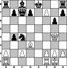 game notation in PGN-format [Event "Ambitionen"] [Site "www.myChess.de"] [Date "2007.01.17"] [Round "1"] [White "WalterKelsch7"] [Black "nogumo"] [ECO "A45"] [WhitemyELO "1798"] [BlackmyELO "1698"] [Result "1-0"] [TimeControl "10/1728000"] [WhiteDays "16"] [BlackDays "20"] [MyChessNo "31704"] 1. d4 Nf6 2. Bf4 e6 3. e3 c5 4. Nf3 Nc6 5. Nc3 cxd4 6. Nxd4 Bb4 7. Bd3 Nxd4 8. exd4 Nd5 9. Bd2 Bxc3 10. bxc3 Qc7 11. Qg4 g6 12. c4 Nb6 13. Ba5 Qc6 14. O-O Nxc4 15. Bb4 a5 16. d5 Qc7 17. dxe6 axb4 18. exf7+ 1-0 position notation in FEN-format r1b1k2r/1pqp1P1p/6p1/8/1pn3Q1/3B4/P1P2PPP/R4RK1 - kq - 0 18 Captured white pieces: Captured black pieces: Click on a captured piece in order to display the desired move!