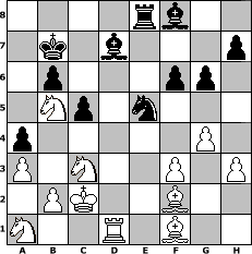 game notation in PGN-format [Event "FC960 Auf ein Neues!"] [Site "www.myChess.de"] [Date "2011.06.14"] [Round "1"] [White "Baehr008"] [Black "Schachfedi"] [Variant "Fischerrandom"] [SetUp "1"] [FEN "nrqkrbbn/pppppppp/8/8/8/8/PPPPPPPP/NRQKRBBN w KQkq - 0 1"] [WhitemyELO "1954"] [BlackmyELO "1792"] [Result "1-0"] [TimeControl "10/2592000"] [WhiteDays "70"] [BlackDays "34"] [MyChessNo "74565"] 1. Nb3 Nb6 2. e4 Ng6 3. f3 e5 4. d4 d5 5. exd5 Qd7 6. c4 Qa4 7. Ng3 Bb4 8. Re4 O-O-O 9. Qc2 f6 10. a3 Nxd5 11. Nc1 Qxc2+ 12. Kxc2 Bf8 13. cxd5 Bxd5 14. Re1 a5 15. dxe5 Nxe5 16. Nd3 Nc4 17. Nc5 b6 18. Rxe8 Rxe8 19. Nce4 Ne5 20. Rd1 Bc6 21. Nc3 Kb8 22. Bf2 Kb7 23. h3 a4 24. Nf5 Bd7 25. g4 g6 26. Nd4 c5 27. Ndb5 1-0 position notation in FEN-format 4rb2/1k1b3p/1p3pp1/1Np1n3/p5P1/P1N2P1P/1PK2B2/N2R1B2 - - - 1 27 Captured white pieces: Captured black pieces: Click on a captured piece in order to display the desired move!