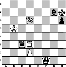 game notation in PGN-format [Event "Arthur Conan Doyle"] [Site "www.myChess.de"] [Date "2009.05.26"] [Round "1"] [White "werderfan"] [Black "neve"] [ECO "D10"] [WhitemyELO "1534"] [BlackmyELO "1550"] [Result "0-1"] [TimeControl "10/1728000"] [WhiteDays "140"] [BlackDays "140"] [MyChessNo "56089"] 1. d4 d5 2. c4 c6 3. Nc3 Nf6 4. Bg5 dxc4 5. e3 b5 6. a4 b4 7. Na2 Ne4 8. Nf3 Nxg5 9. Nxg5 Qd5 10. Nf3 a5 11. Rc1 c3 12. b3 Bg4 13. h3 Bxf3 14. gxf3 g6 15. Bc4 Qd6 16. Nxc3 bxc3 17. Rxc3 Bg7 18. h4 c5 19. Bb5+ Nd7 20. Rxc5 O-O 21. Bxd7 Qxd7 22. h5 Rfd8 23. hxg6 fxg6 24. f4 Rdb8 25. f5 gxf5 26. Qh5 h6 27. Rxf5 e6 28. Rxa5 Rxa5 29. Qxa5 Rxb3 30. Qa8+ Kh7 31. Qe4+ Kg8 32. Qa8+ Kf7 33. Qf3+ Ke7 34. Qe4 Qe8 35. Qh7 Kf6 36. Rh3 Rb1+ 37. Ke2 Rg1 38. Rf3+ Ke7 39. Qe4 Qc8 40. Qh4+ Kd6 41. Qh2+ Kd5 42. e4+ Kxe4 43. Re3+ Kd5 44. Qh5+ Rg5 45. Qh1+ Kd6 46. Qh2+ Kd7 47. Kd3 Qa6+ 48. Ke4 Qxa4 49. Rd3 Rd5 50. Qb8 Qc4 51. Qa7+ Qc7 52. Qa4+ Ke7 53. Qa3+ Kf7 54. Rf3+ Kg6 55. Rg3+ Kh7 56. Rd3 Qc2 57. Ke3 Rf5 58. f4 Qh2 59. Qd6 e5 60. dxe5 Qxf4+ 61. Ke2 Rxe5+ 62. Kd1 Qf1+ 63. Kc2 Re2+ 64. Kb3 Rb2+ 65. Kc4 Rc2+ 66. Kb5 Rc3 0-1 position notation in FEN-format 8/6bk/3Q3p/1K6/8/2rR4/3P4/5q2 - - - 10 67 Captured white pieces: Captured black pieces: Click on a captured piece in order to display the desired move!