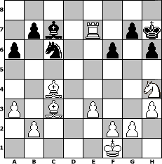 game notation in PGN-format [Event "Mein Zweij"] [Site "www.myChess.de"] [Date "2009.09.25"] [Round "1"] [White "RashimIbenRohal"] [Black "bruno"] [ECO "D35"] [WhitemyELO "1493"] [BlackmyELO "1764"] [Result "1-0"] [TimeControl "10/864000"] [WhiteDays "08"] [BlackDays "10"] [MyChessNo "59282"] 1. d4 d5 2. c4 e6 3. Nc3 Nf6 4. e3 c5 5. Nf3 Nc6 6. cxd5 exd5 7. Bb5 Bd7 8. O-O Bd6 9. dxc5 Bxc5 10. Nxd5 a6 11. Nxf6+ Qxf6 12. Be2 Rd8 13. Qc2 Bb6 14. Bd2 O-O 15. Bc3 Qe6 16. a3 Rfe8 17. Rfd1 Bc7 18. Rd2 Qf5 19. Qxf5 Bxf5 20. Rad1 Rxd2 21. Rxd2 f6 22. Bc4+ Kh8 23. Kf1 h6 24. h3 Kh7 25. Nh4 Bd7 26. Rxd7 Re7 27. Rxe7 1-0 position notation in FEN-format 8/1pb1R1pk/p1n2p1p/8/2B4N/P1B1P2P/1P3PP1/5K2 - - - 0 27 Captured white pieces: Captured black pieces: Click on a captured piece in order to display the desired move!