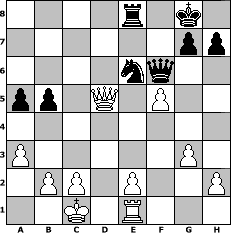 game notation in PGN-format [Event "Sommerlaune"] [Site "www.myChess.de"] [Date "2009.07.15"] [Round "2"] [White "HPB2005"] [Black "espero"] [ECO "C17"] [WhitemyELO "1915"] [BlackmyELO "1681"] [Result "1-0"] [TimeControl "10/2592000"] [WhiteDays "61"] [BlackDays "87"] [MyChessNo "57558"] 1. e4 e6 2. d4 d5 3. Nc3 Bb4 4. e5 c5 5. a3 Ba5 6. Bd2 Nc6 7. Nb5 Bxd2+ 8. Qxd2 Nxd4 9. Nxd4 cxd4 10. Nf3 Ne7 11. Nxd4 Bd7 12. f4 O-O 13. g3 Nc6 14. Nf3 f6 15. exf6 Qxf6 16. O-O-O a6 17. Bh3 b5 18. Rhe1 a5 19. Ng5 Rae8 20. Bxe6+ Bxe6 21. Rxe6 Rxe6 22. Qxd5 Nd8 23. Re1 Rfe8 24. Nxe6 Nxe6 25. f5 1-0 position notation in FEN-format 4r1k1/6pp/4nq2/pp1Q1P2/8/P5P1/1PP1P2P/2K1R3 - - - 0 25 Captured white pieces: Captured black pieces: Click on a captured piece in order to display the desired move!