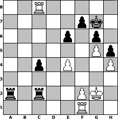 game notation in PGN-format [Event "Karnevalsstress"] [Site "www.myChess.de"] [Date "2009.02.15"] [Round "1"] [White "edudoc32"] [Black "Plaidroller"] [ECO "A30"] [WhitemyELO "1804"] [BlackmyELO "1799"] [Result "0-1"] [TimeControl "10/1728000"] [WhiteDays "80"] [BlackDays "75"] [MyChessNo "52785"] 1. c4 c5 2. Nf3 Nc6 3. d4 cxd4 4. Nxd4 Nf6 5. Nc3 e6 6. e3 Bb4 7. Be2 Ne4 8. Bd2 Nxd2 9. Qxd2 O-O 10. O-O d6 11. Rfd1 Qe7 12. Rac1 Nxd4 13. Qxd4 Bc5 14. Qd2 Bd7 15. Bf3 Bc6 16. Bxc6 bxc6 17. Ne4 Rab8 18. Nxc5 dxc5 19. Qd7 Qxd7 20. Rxd7 Rxb2 21. Rxa7 Rd8 22. a4 g6 23. a5 Rd2 24. Rf1 Rdc2 25. h3 Rxc4 26. g4 Ra4 27. Kg2 Rba2 28. Rd1 Rxa5 29. Rc7 Ra7 30. Rxc6 Rc2 31. h4 Raa2 32. Rf1 Kg7 33. g5 h5 34. Kf3 Ra4 35. e4 Ra3+ 36. Kg2 c4 37. Rc8 Raa2 0-1 position notation in FEN-format 2R5/5pk1/4p1p1/6Pp/2p1P2P/8/r1r2PK1/5R2 - - - 2 38 Captured white pieces: Captured black pieces: Click on a captured piece in order to display the desired move!