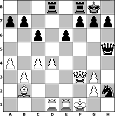 game notation in PGN-format [Event "Blackmar-Diemer"] [Site "www.myChess.de"] [Date "2009.08.30"] [Round "1"] [White "Caligula"] [Black "ujack1961"] [ECO "D00"] [WhitemyELO "1416"] [BlackmyELO "1688"] [Result "0-1"] [TimeControl "10/2592000"] [WhiteDays "119"] [BlackDays "090"] [MyChessNo "58647"] 1. d4 d5 2. e4 dxe4 3. Nc3 Nf6 4. f3 exf3 5. Qxf3 c6 6. Be3 Bg4 7. Qf2 Qa5 8. Be2 Ne4 9. Qf4 Nxc3 10. Bd2 Bxe2 11. Bxc3 Qa4 12. b3 Qb5 13. Nxe2 e6 14. Qf3 Bb4 15. O-O O-O 16. Bb2 Qg5 17. a3 Be7 18. Bc1 Qd5 19. Qf2 Nd7 20. c4 Qh5 21. Ng3 Qg6 22. Bb2 Bh4 23. Qf3 Bxg3 24. hxg3 Rae8 25. Rae1 Nf6 26. a4 Rd8 27. Rd1 Ng4 28. Rfe1 Qh5 29. Kf1 Nh2+ 0-1 position notation in FEN-format 3r1rk1/pp3ppp/2p1p3/7q/P1PP4/1P3QP1/1B4Pn/3RRK2 - - - 7 30 Captured white pieces: Captured black pieces: Click on a captured piece in order to display the desired move!